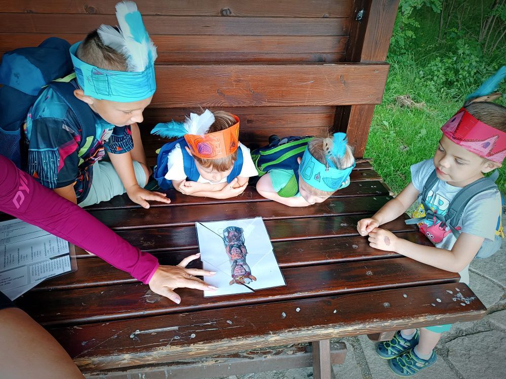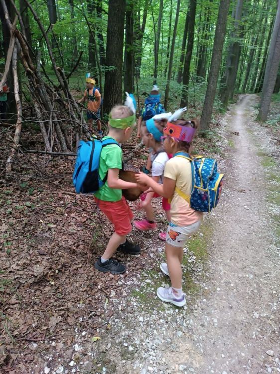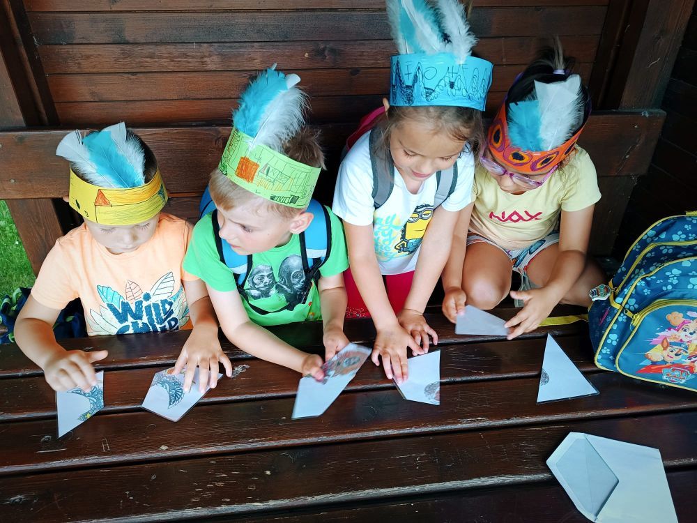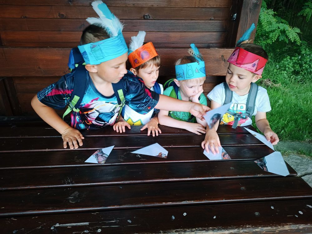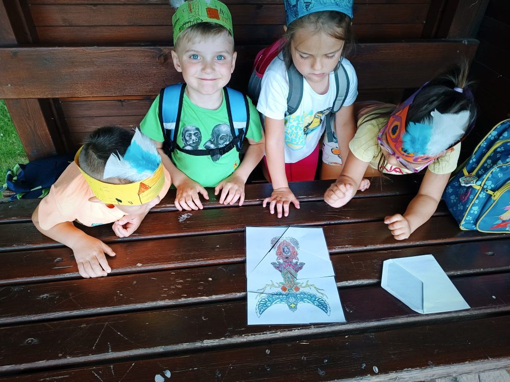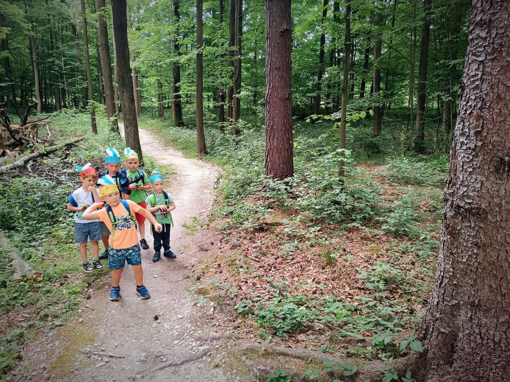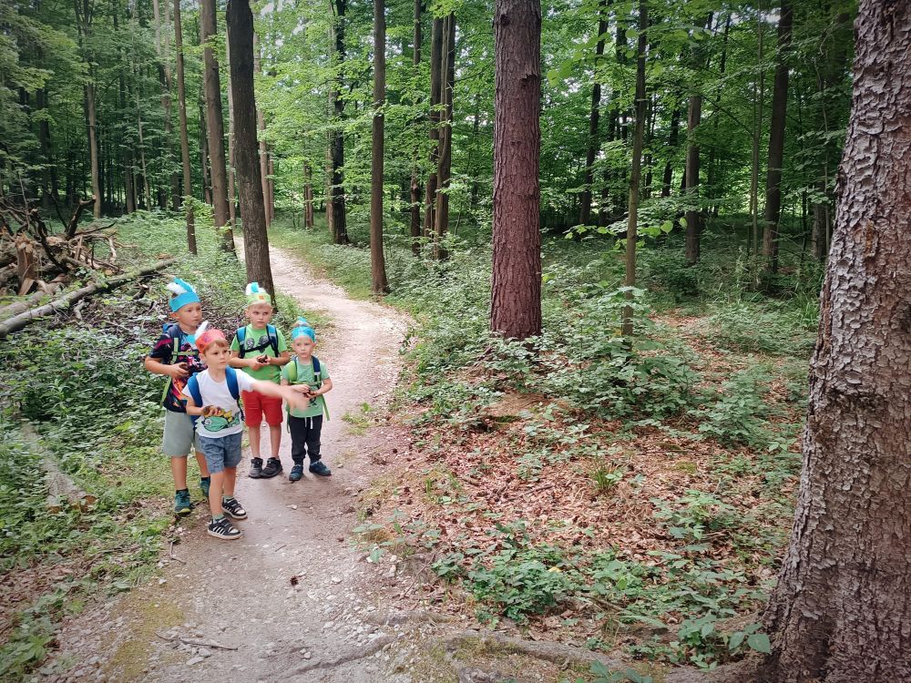 Dnes děti zažily indiánské dopoledne. Ráno jsme si vyrobili indiánské čelenky a po svačince jsme se vypravili směrem k rybníkům plnit různé indiánské úkoly. Děti skládaly obrázky totemů, lovily bizony, schovávaly se před medvědem, společně stavěly teepee, závodily v běhu a nakonec hledaly v lese ukrytý indiánský poklad.