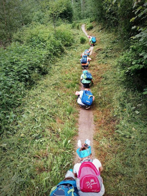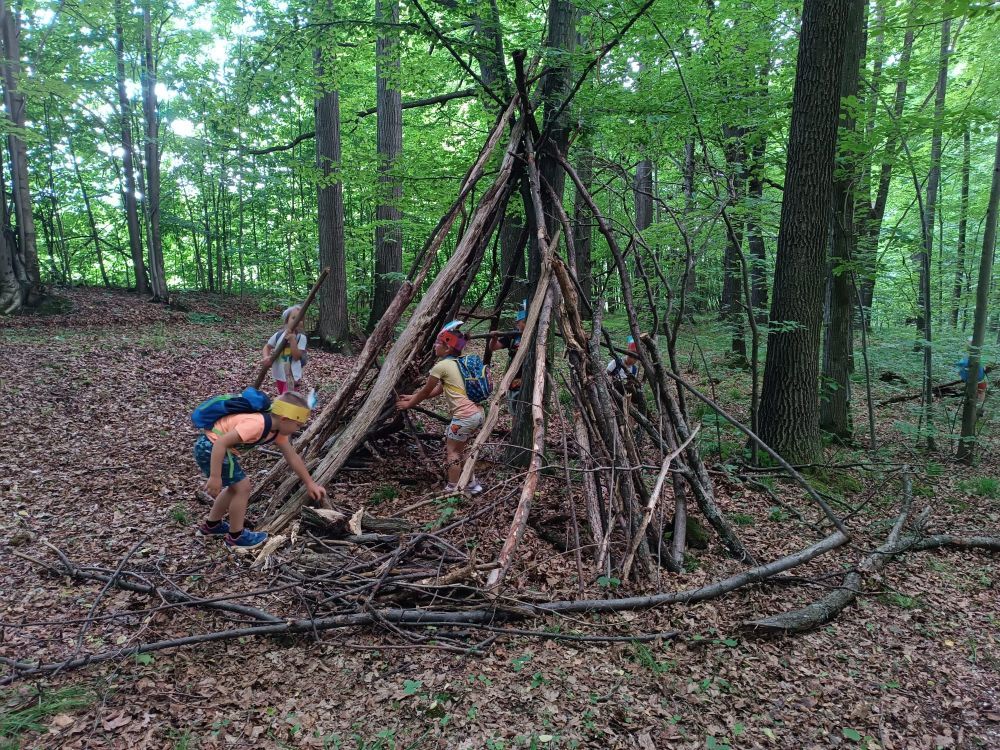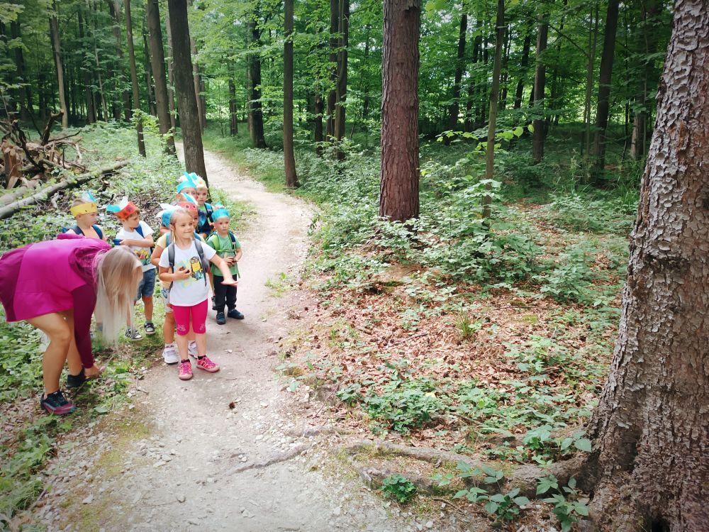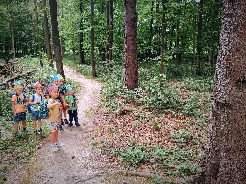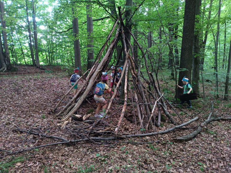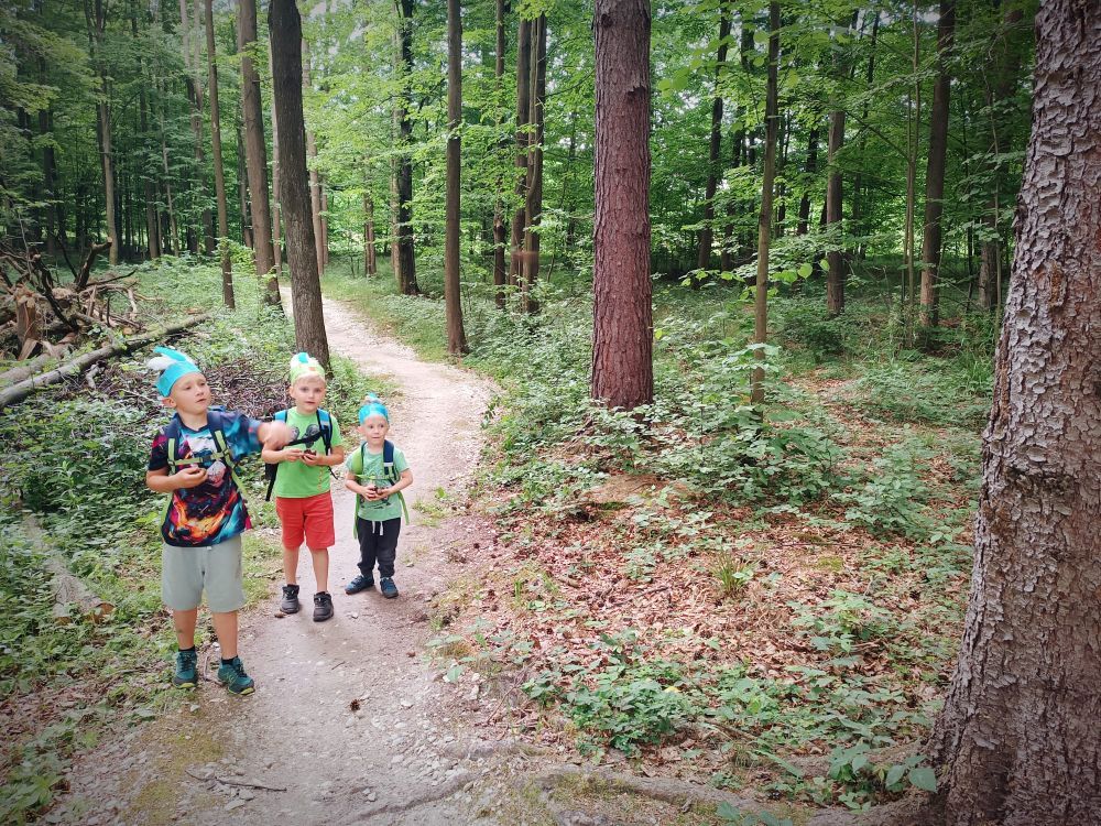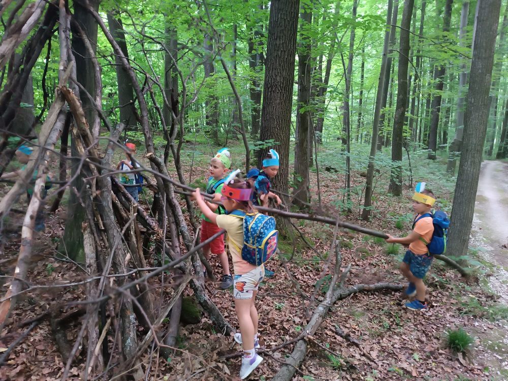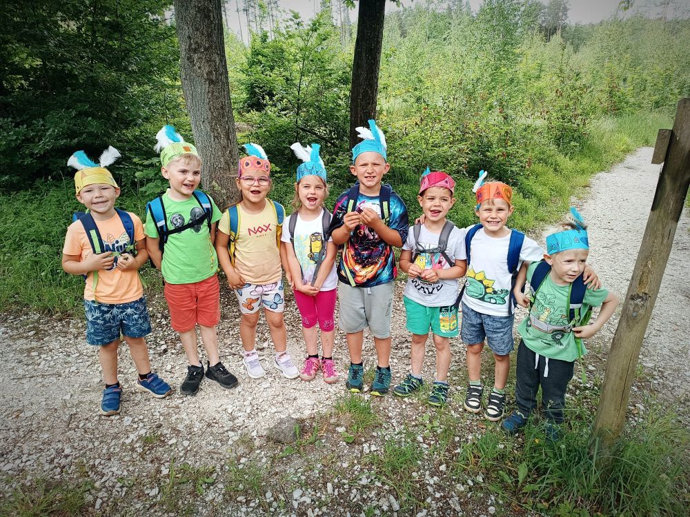 Dnes děti zažily indiánské dopoledne. Ráno jsme si vyrobili indiánské čelenky a po svačince jsme se vypravili směrem k rybníkům plnit různé indiánské úkoly. Děti skládaly obrázky totemů, lovily bizony, schovávaly se před medvědem, společně stavěly teepee, závodily v běhu a nakonec hledaly v lese ukrytý indiánský poklad.