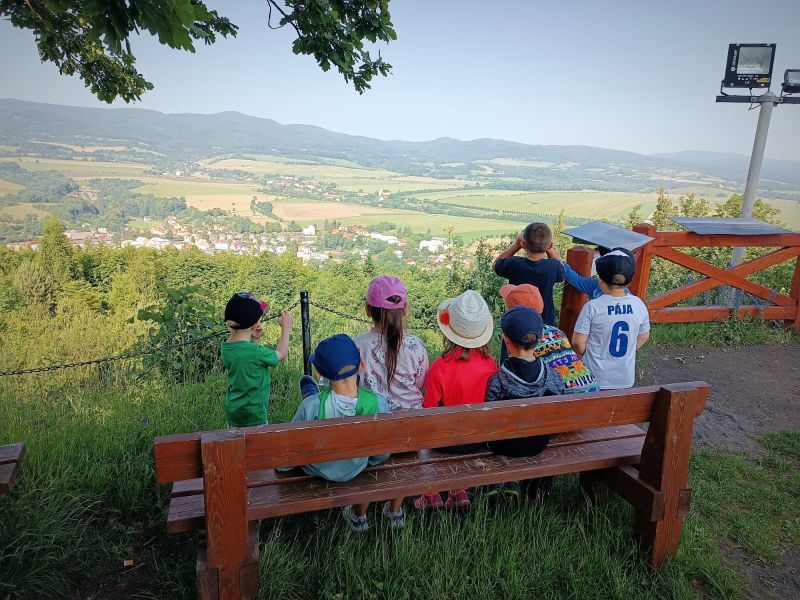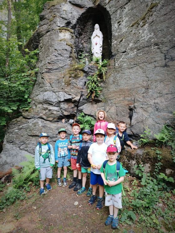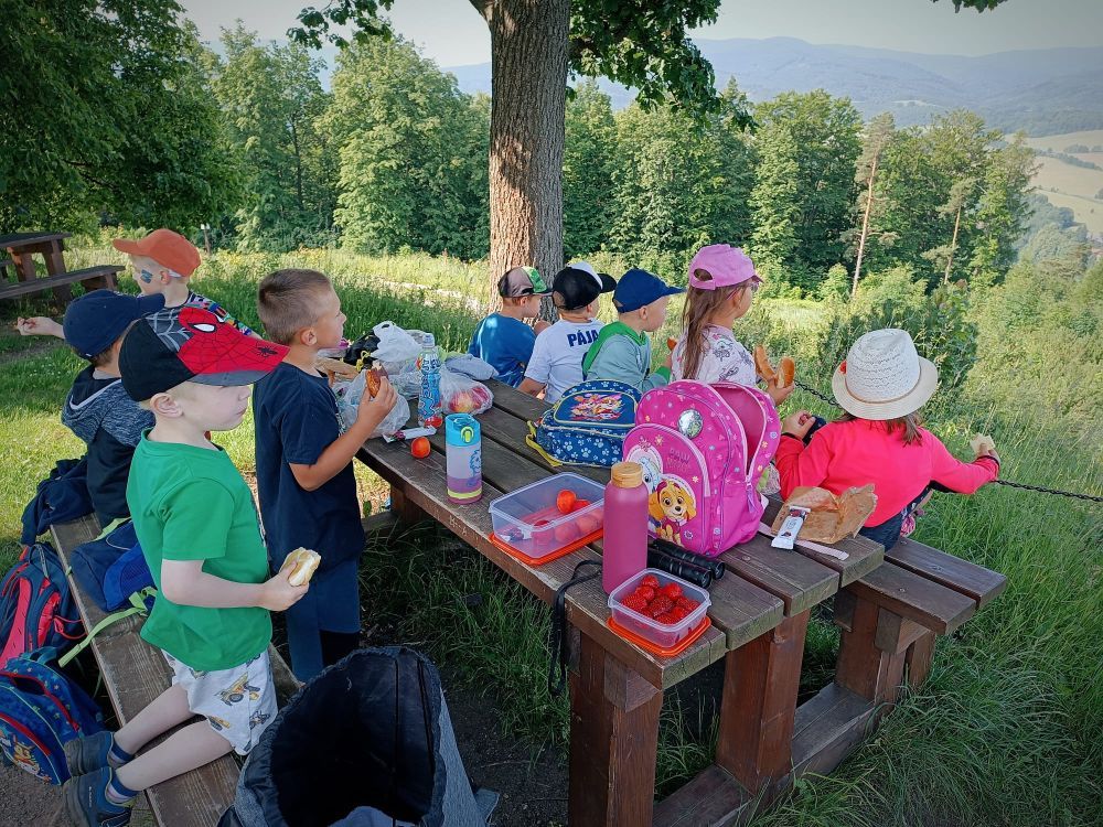 Dnes jsme se s dětmi vydali na slíbený výlet na Boží horu. Ráno jsme jeli autobusem do Žulové a odtud se vydali pěšky směrem na vrchol Boží hory. Cestou jsme si prohlédli sochu Panny Marie ve skále, na vrcholku jsme si dali svačinu a pak se vydali pěšky směrem na Bažantnici a odtud do školky. Cestou jsme sbírali lesní jahůdky, pozorovali zvířata, poznávali stromy a známé rostliny. Počasí nám přálo a do školky jsme se vrátili akorát na oběd. Výlet se nám opravdu vydařil.